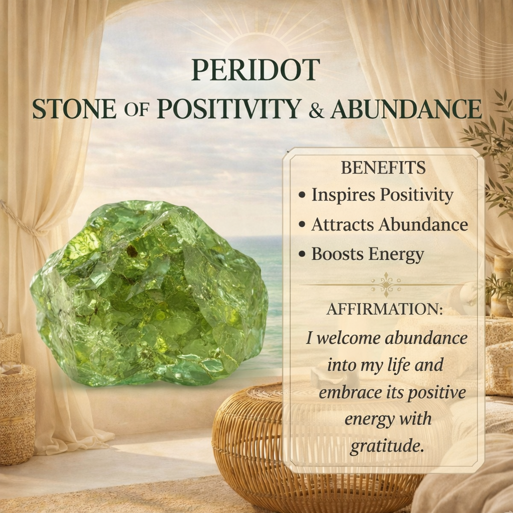 Peridot carries the effervescent energy of the sun. It acts as a powerful emotional cleanser, dissolving heavy burdens like guilt or resentment and replacing them with confidence and optimism.