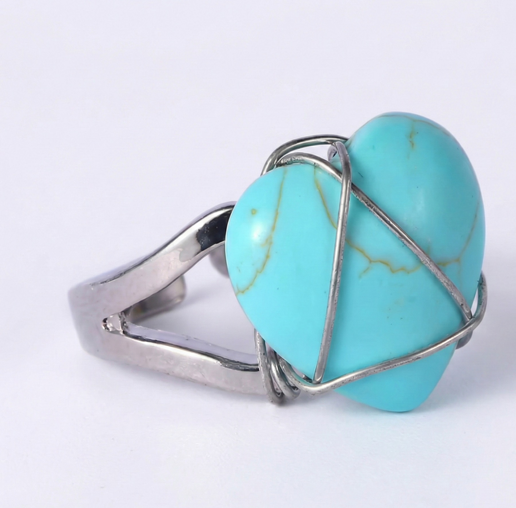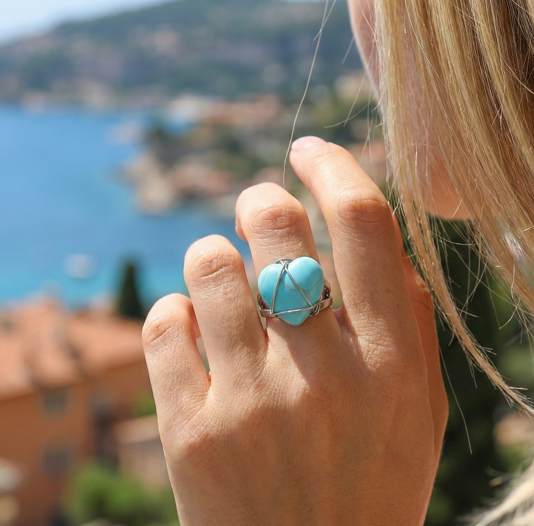 Inspired by the sun-drenched glamour of Pampelonne Beach and the playful spirit of an endless summer, the Saint-Tropez Sweetheart captures the vibrant pulse of a Riviera romance. This captivating ring features a bold, heart-shaped Turquoise, embraced by a free-spirited silver wire wrapping that mimics the wild, uncontainable energy of the sea. It is a wearable love letter to the Mediterranean—a statement piece designed to rest joyfully on your hand, broadcasting vitality and affection in every gesture.